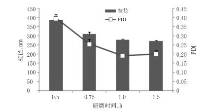 2.1.3研磨時(shí)間的篩選稱(chēng)取BRE原料藥7.5g,置于含有吐溫80(1.125g)的水溶液(22.5mL)中,攪拌混懸,加入氧化鋯珠(粒徑為0.6mm)450g,分別研磨0.5、0.75、1.0、1.5h,制備3批BRE納米晶混懸液。以BRE納米晶混懸液的粒徑、PDI為指標(biāo),篩選研磨時(shí)間。結(jié)果,隨著研磨時(shí)間的延長(zhǎng),BRE納米晶混懸液的粒徑、PDI逐漸減??;研磨0.5、0.75、1.0h時(shí),BRE納米晶混懸液的粒徑、PDI減小的幅度較大;研磨1.5h時(shí),BRE納米晶混懸液粒徑雖然較研磨1.0h時(shí)的粒徑減小,但減小幅度不大。綜合考慮能耗和時(shí)間,確定研磨時(shí)間為1h。研磨時(shí)間的篩選結(jié)果見(jiàn)圖3。